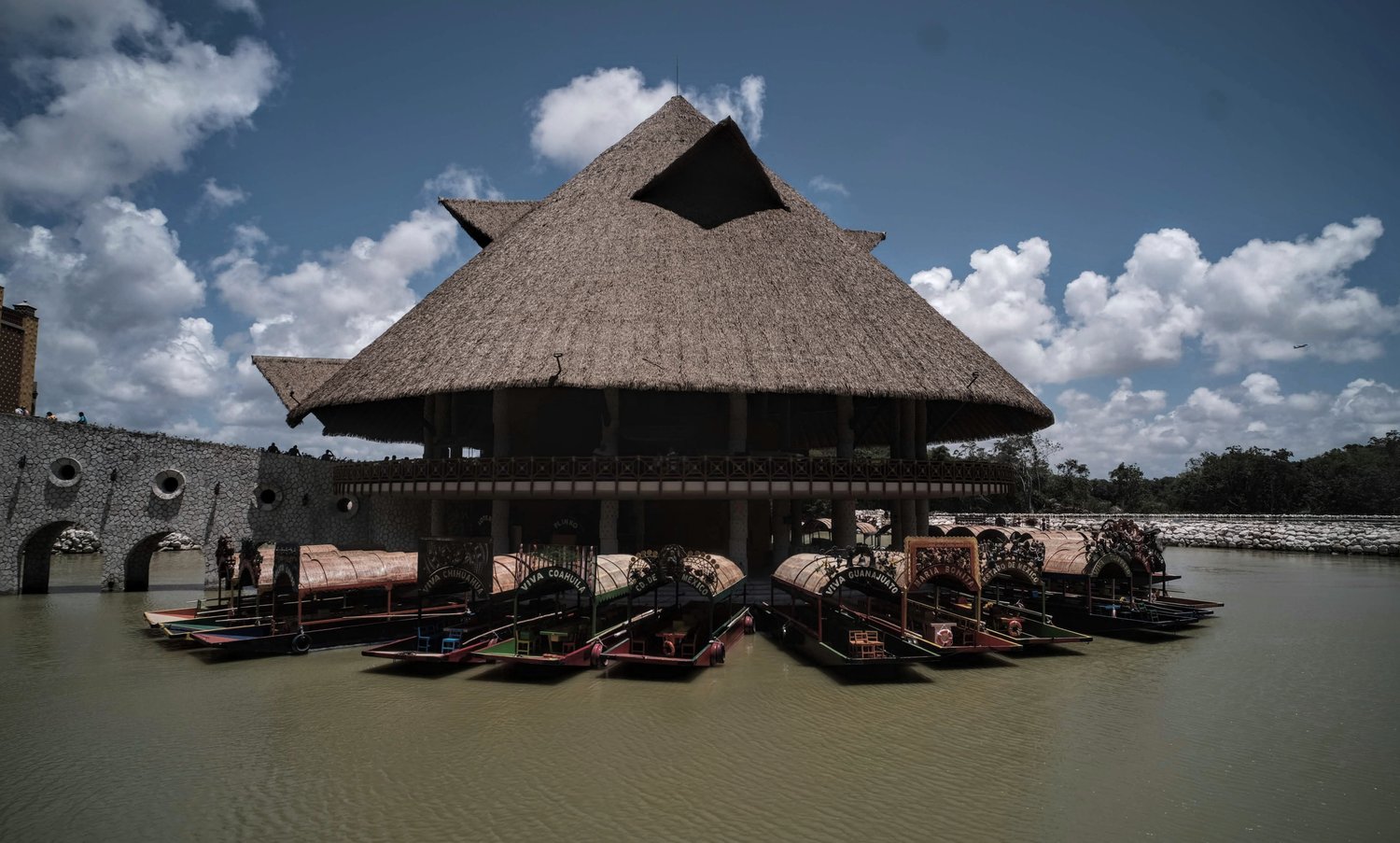 Un rincón mágico en el parque Xoximilco, de Grupo Xcaret, en Cancún. Trajineras coloridas flotan bajo un techo de paja, evocando la tradición mexicana.