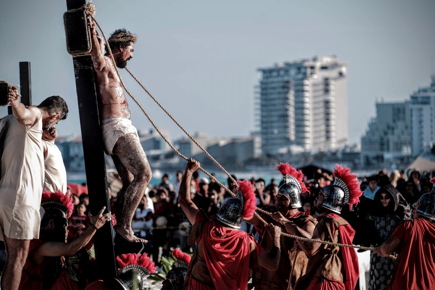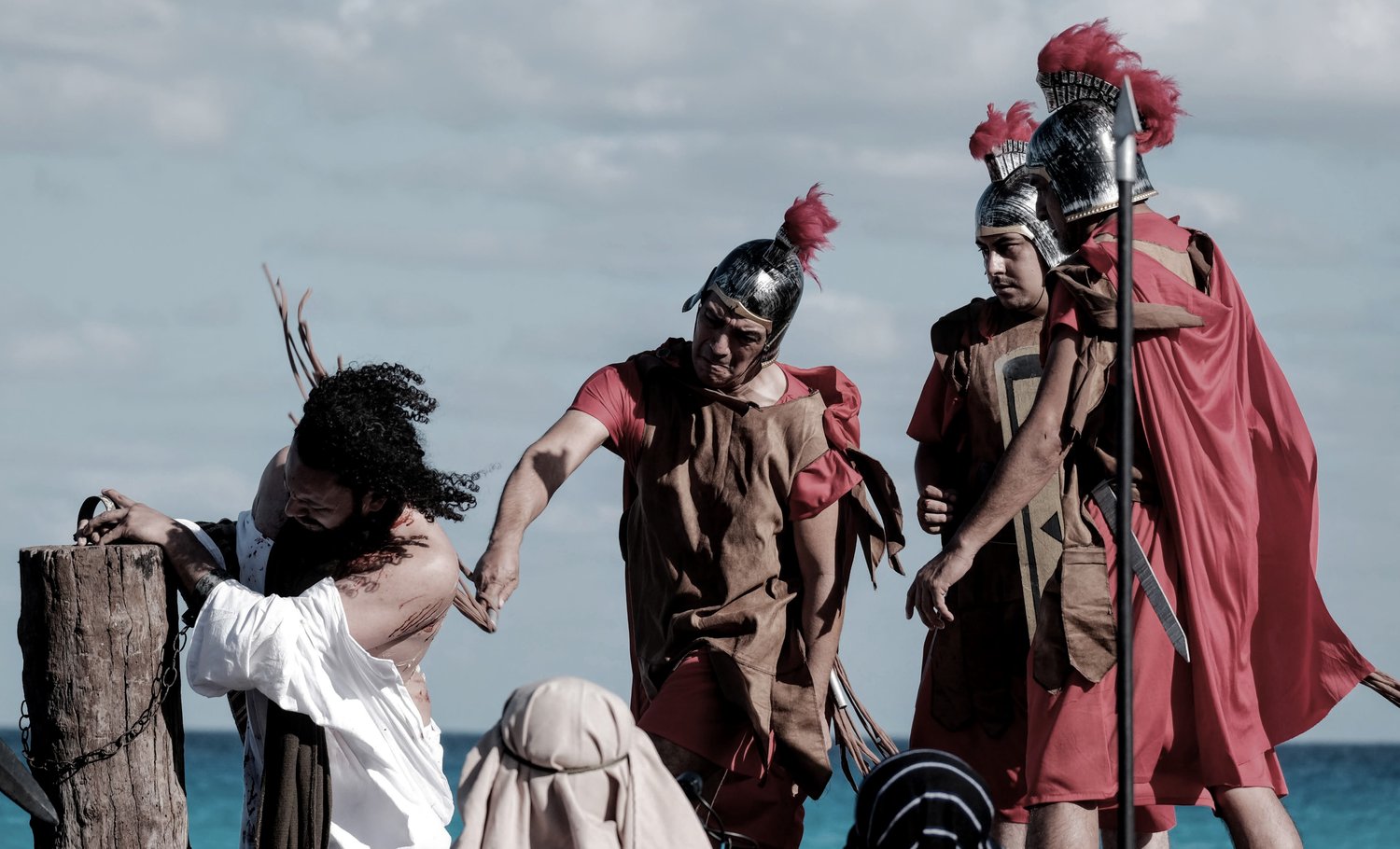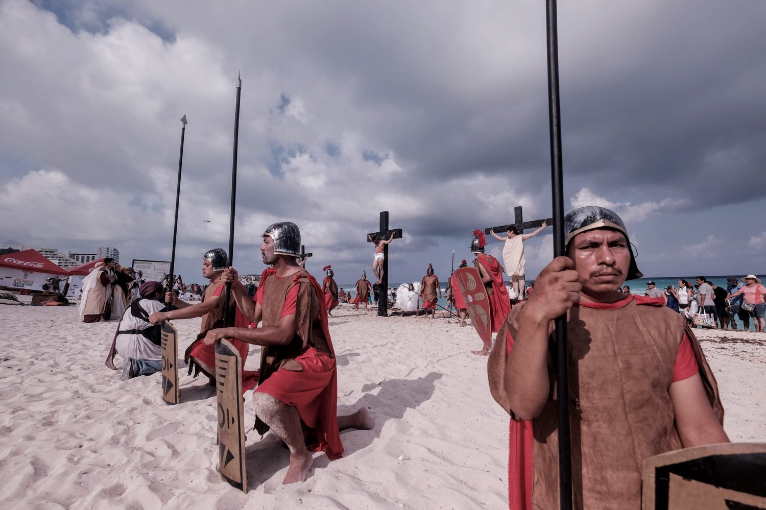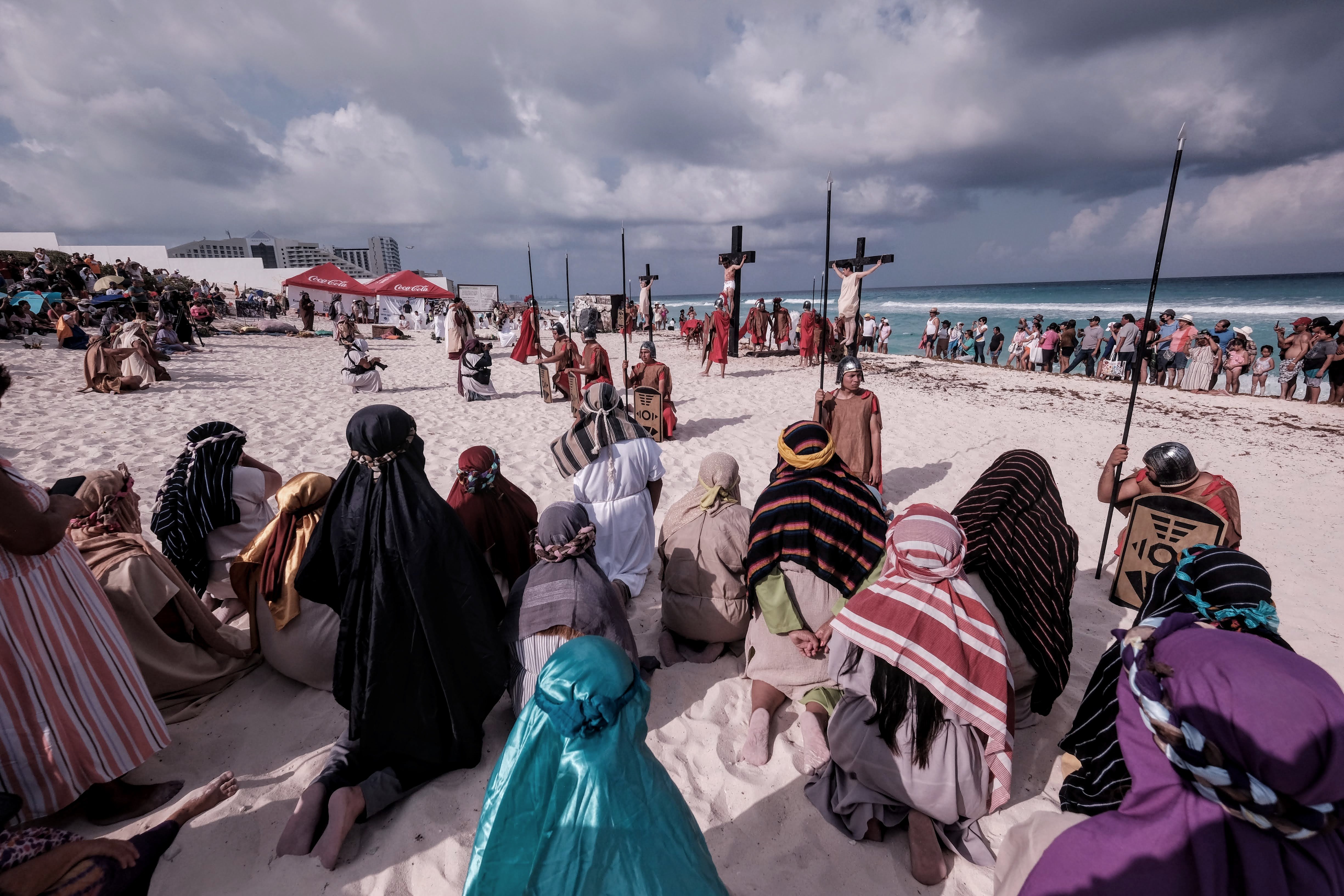 Esta tradicional puesta en escena del Viacrucis en Playa Delfines de Cancún es una realización del grupo Evangelización Creativa y Nicte Ha Sabido.