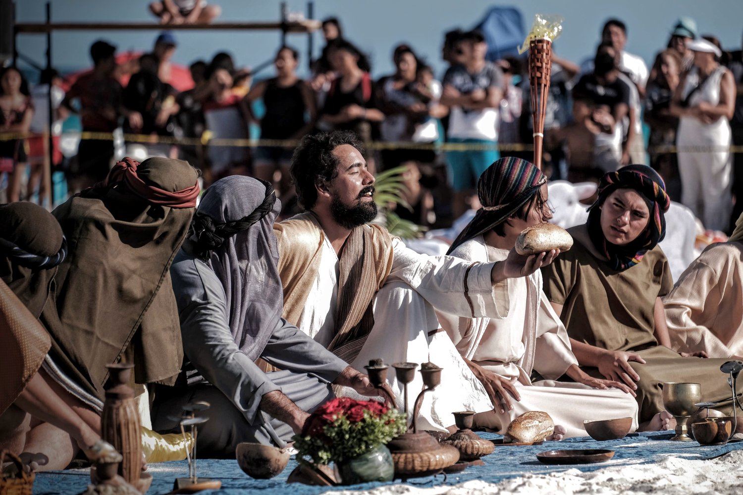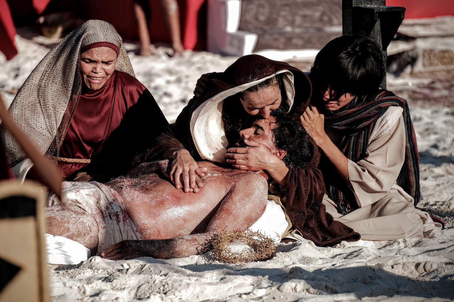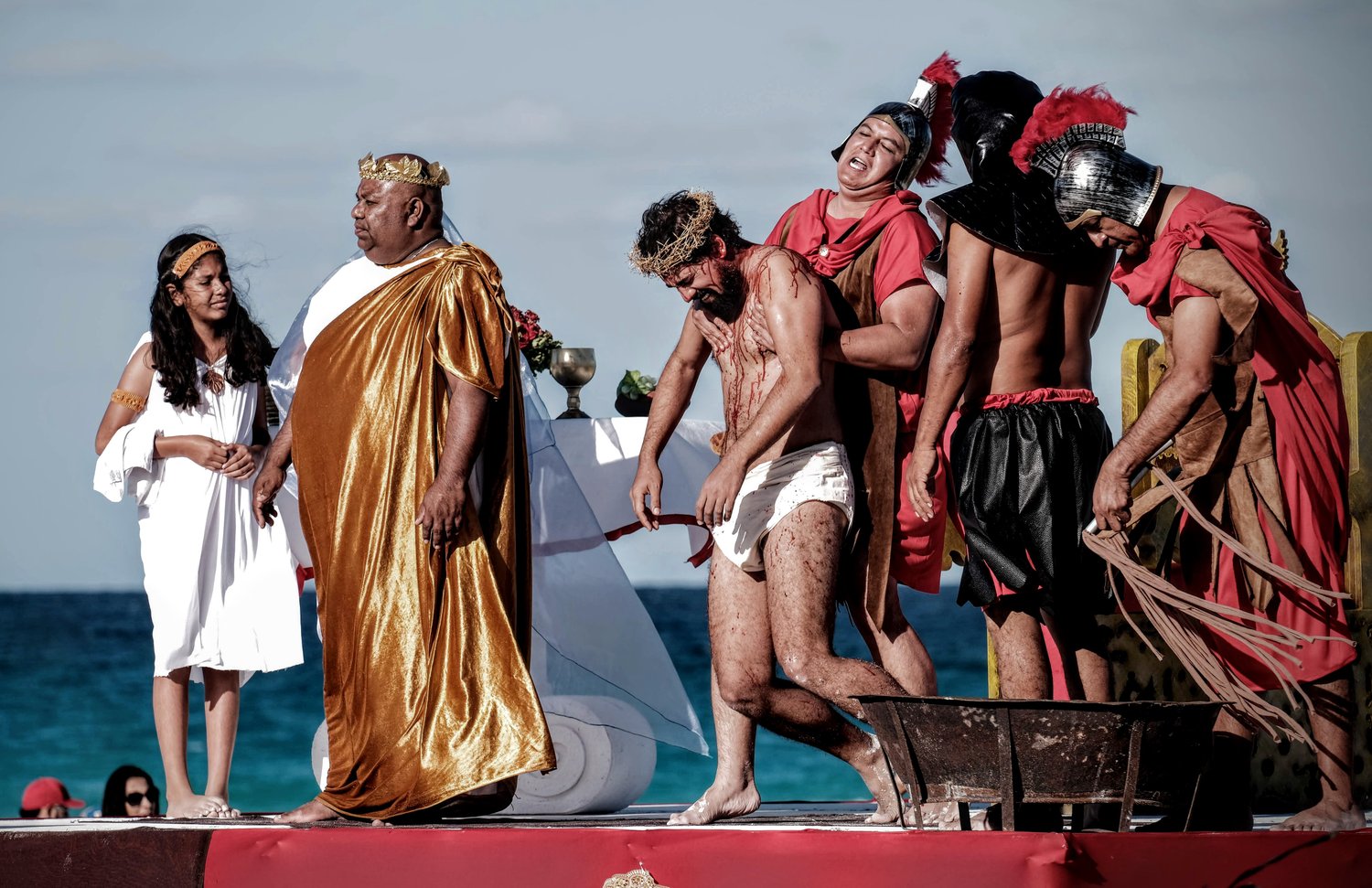 Esta tradicional puesta en escena del Viacrucis en Playa Delfines de Cancún es una realización del grupo Evangelización Creativa y Nicte Ha Sabido.
